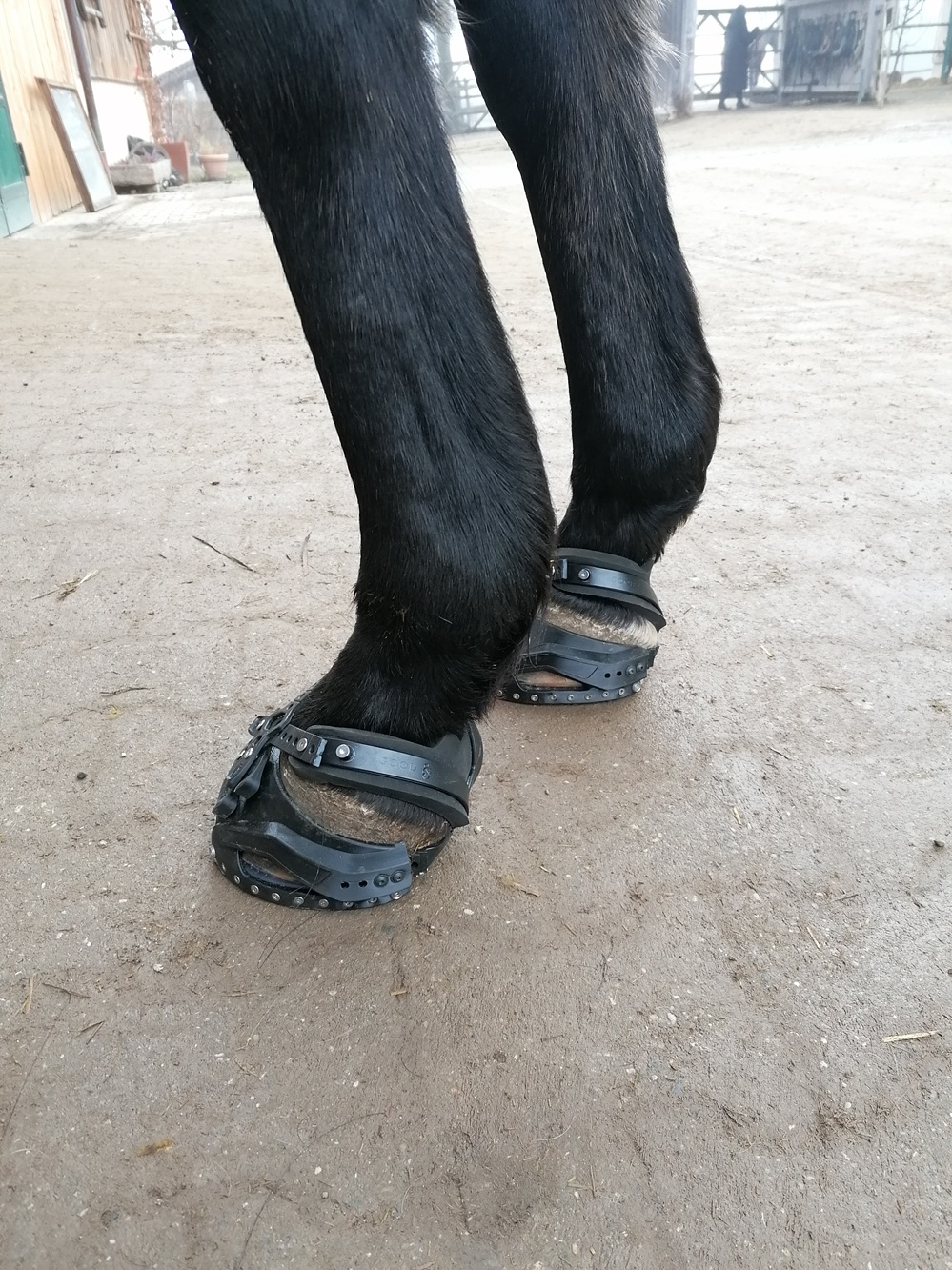 Der Goodsmith Hufschuh ist schlank und sportlich, trägt kaum auf und sitzt (bei richtiger Anpassung) sehr gut am Huf. Alle Einzelteile können ersetzt und ausgetauscht werden. Wenn die Platte abgelaufen ist, aber der Rest vom Schuh noch in gutem Zustand, kann einfach nur die Platte erneuert werden. Ich finde die Schuhe vor allem dann sehr sinnvoll, wenn ansonsten nichts Passendes zu finden ist aufgrund einer schwierigen Hufform. Oder aber auch, wenn man aufgrund von Krankheiten (z.B. Hufrollensyndrom oder Arthrose) einen optimalen Abrollpunkt und Trachtenlandepunkt schaffen möchte. Auch für Pferde, die andere Hufschuhe verlieren, können die Goodsmith Hufschuhe eine sinnvolle Möglichkeit sein.